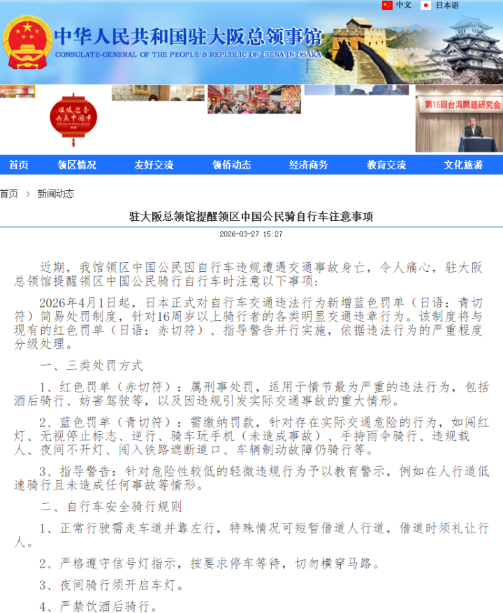3月27日,中国驻大阪总领馆发文表示,近期,该馆领区中国公民因自行车违规遭遇交通事故身亡,令人痛心。总领馆提醒领区中国公民骑自行车时注意以下事项: