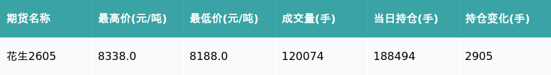 南财智讯3月26日电,盘后期货数据显示,郑州商品交易所的花生主力合约收涨0.83%,收盘报8258.0元/吨,日内资金流入2666.6万元。其他相关指标见下表: